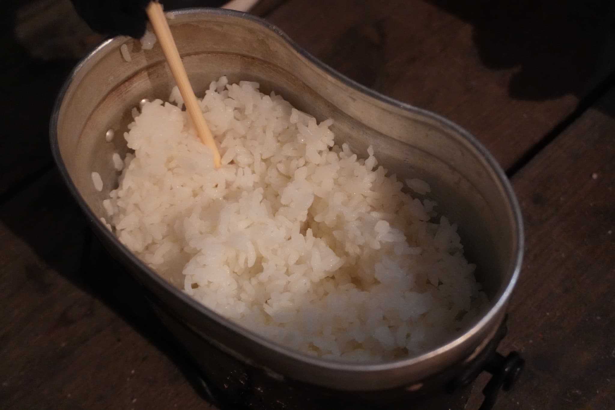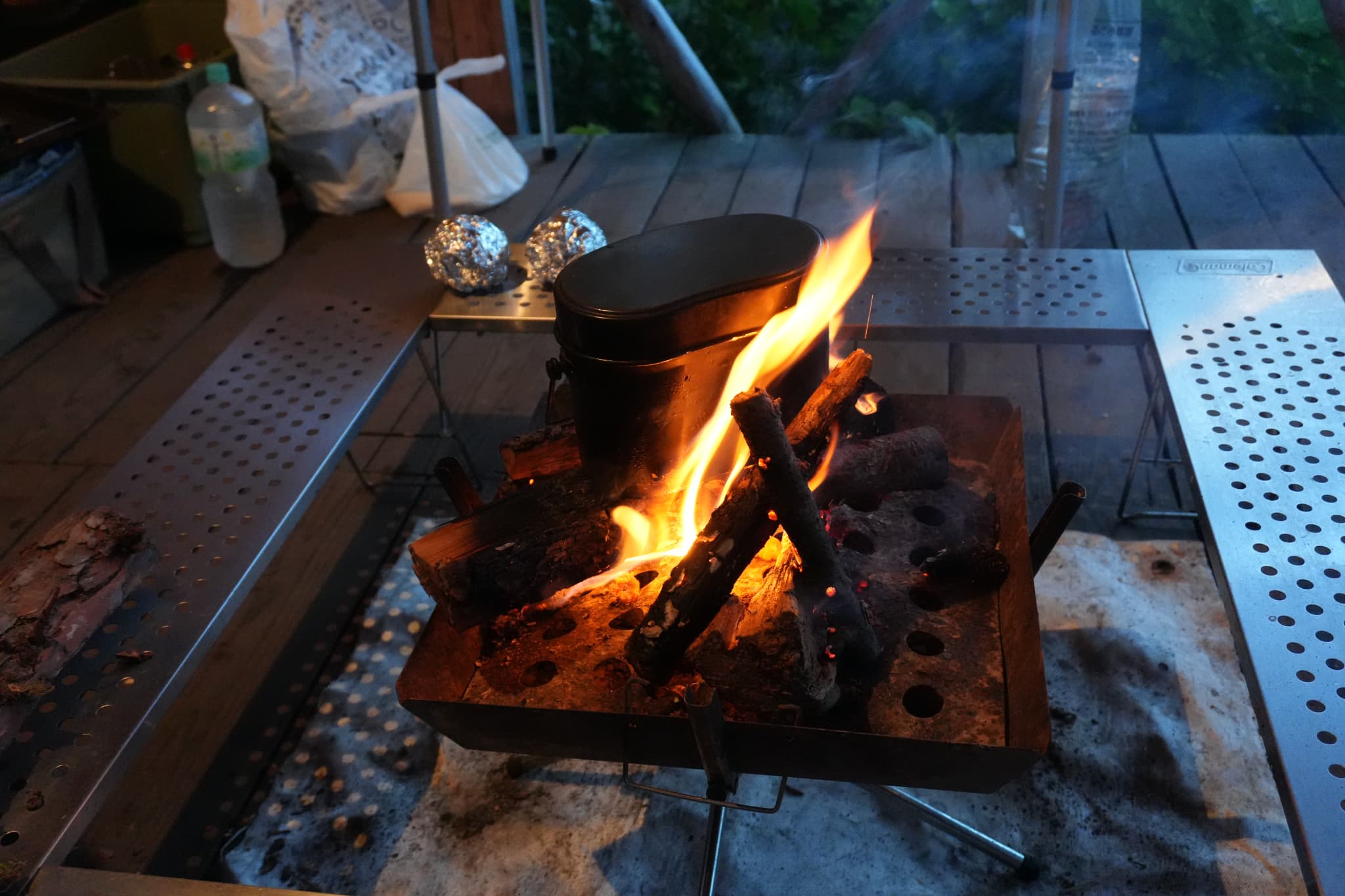 ようやく火がついて落ち着いたら、焚き火台に飯盒をセットしてごはんを炊きます。奥にあるアルミホイルにつつんだジャガイモも投入。