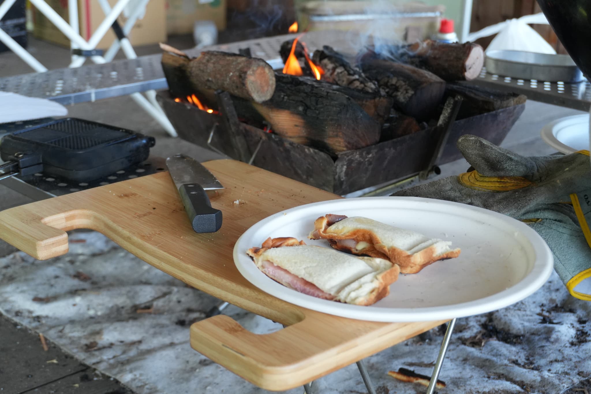 朝食は焚き火台に火をおこしてホットサンド。(ホットサンドクッカーもレンタルに入ってます。)