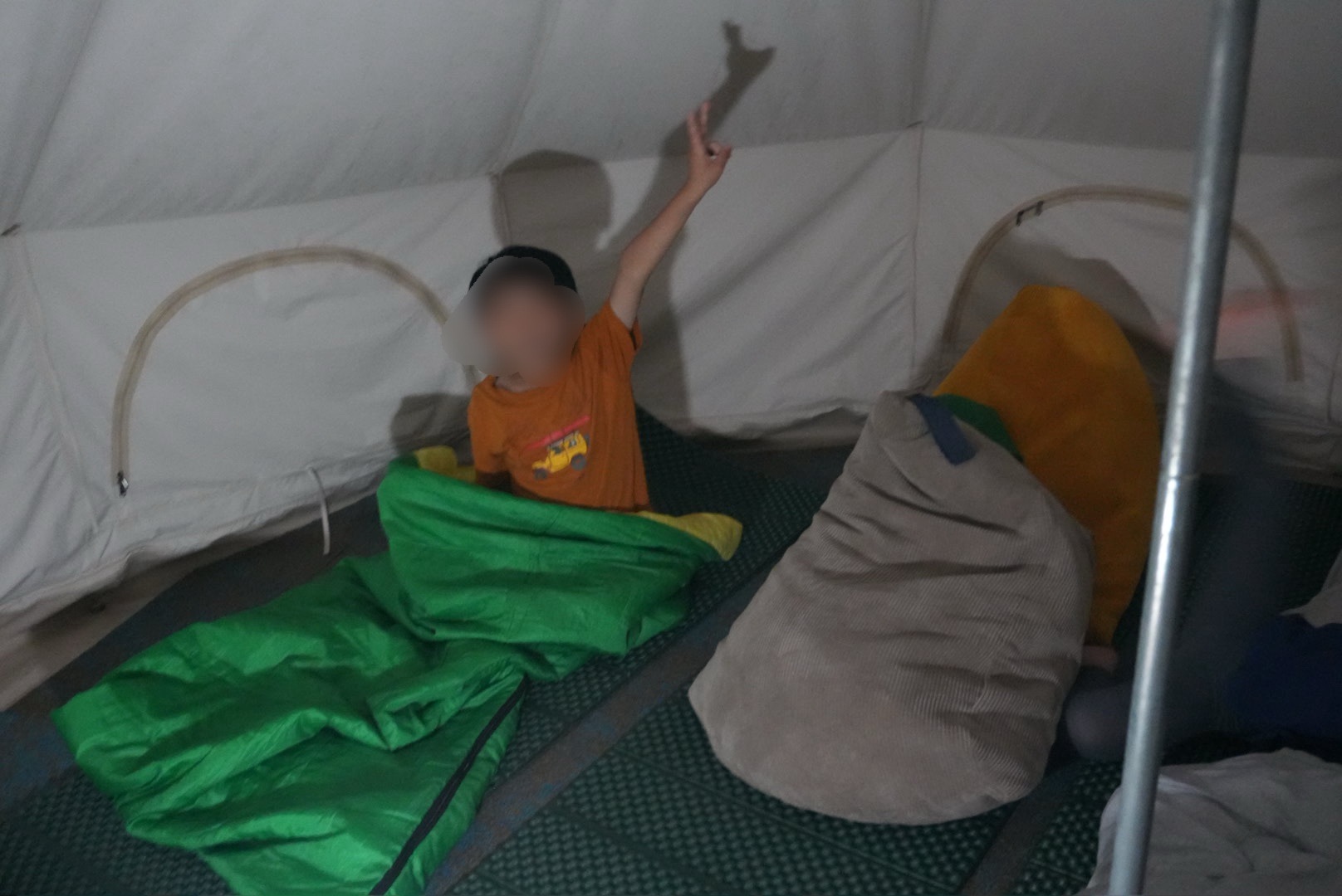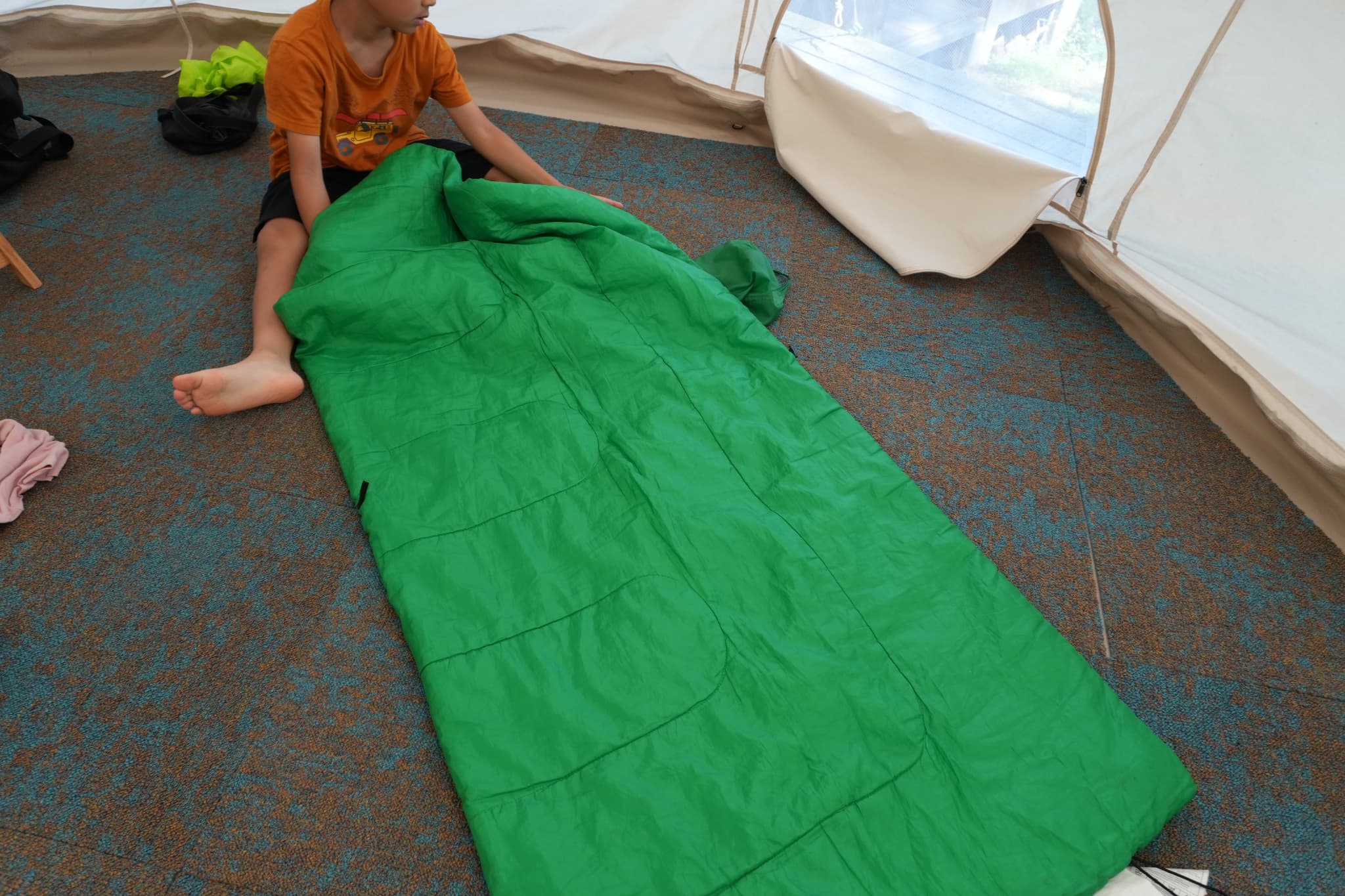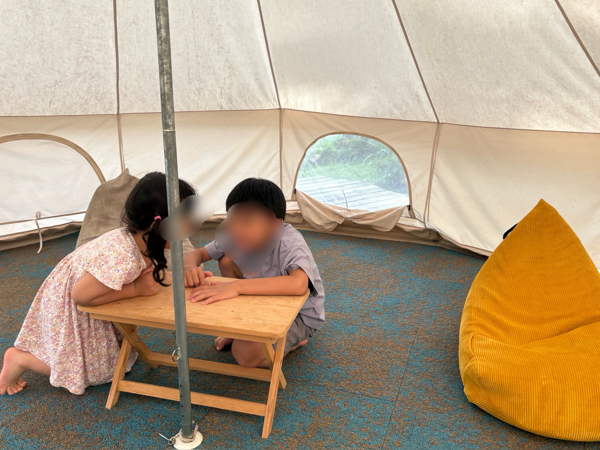 子どもたちはテント泊が初めてだったんですが、常設ベルテントは床もカーペットフロアで居心地よくクッションと寝袋でテント泊気分を味わいつつ寝ることができました。