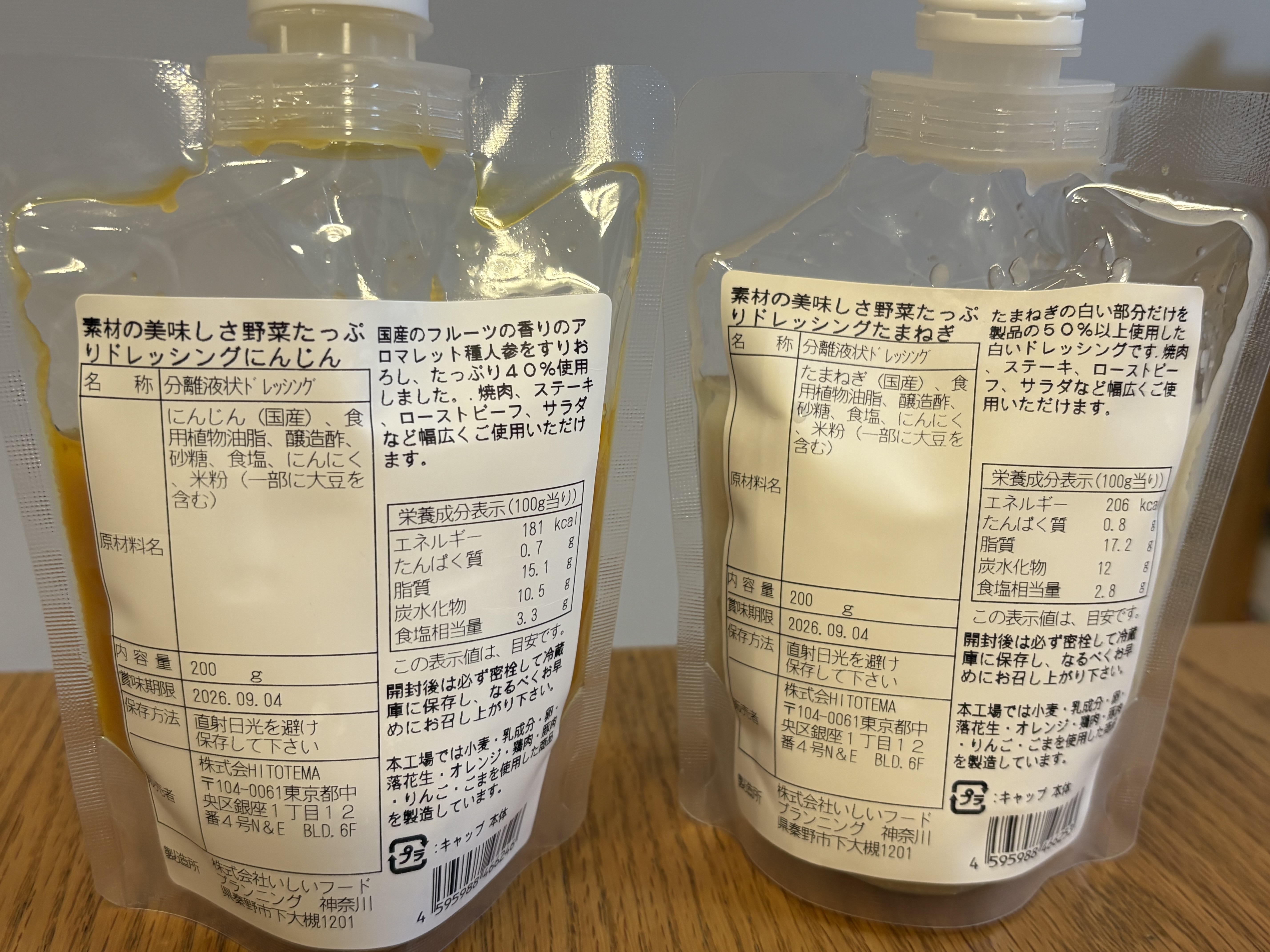 SAKURA’sのドレッシングはにんじんとたまねぎの2種類があって、それぞれ原料はにんじん・たまねぎのほかには、食用植物油脂、醸造酢、砂糖、食塩、にんにく、米粉のみ。